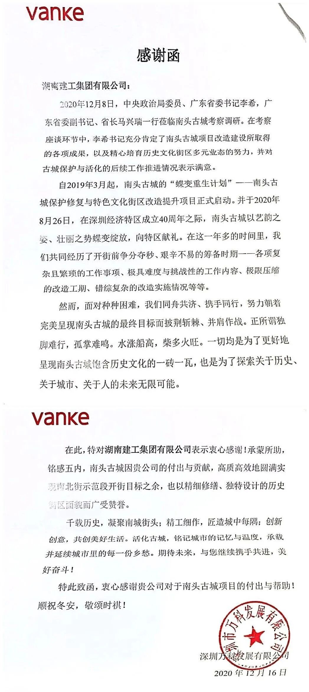 我局承建的南頭古城項目以精細修繕、獨特設計的歷史街區(qū)面貌而廣受贊譽,12月16日,深圳萬科集團發(fā)展有限公司特此致函以示感謝。